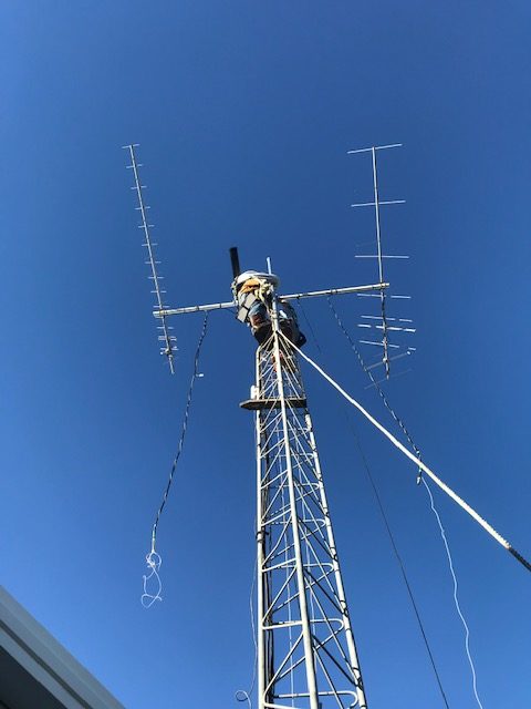On Friday, January 4th, scheduled maintenance was performed on our satellite antennas. The last maintenance was performed around 10 years ago so there were several goals during this work: inspect the 2m and 70cm antennas, inspect and seal the crossboom, install a new 23cm antenna and run a new feed of heliax, replace jumpers with flex jumpers and secure to each antenna, and try to avoid Murphy.